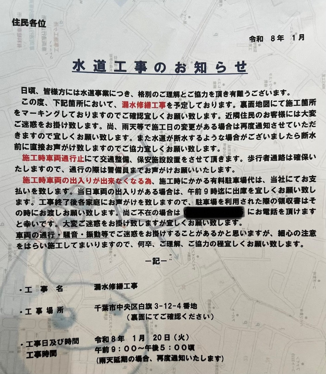 1月20日(火)に近隣にて水道工事があるそうで、その関係で提携駐車場であるNaviパーク白旗第3がもしかしたら埋まってしまっているかもしれません。